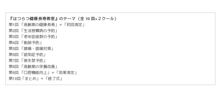 いつまでも健康で、いきいきとした毎日を送るためのサポートを目的とした介護予防教室です。やや体力に不安のあるシニア層を対象とし、様々な健康まつわるテーマに沿ったセミナーと介護予防運動の実技を行います。(開催予定: 平成30年 9月から平成31年2月、第1回は9月6日(木)を予定)
