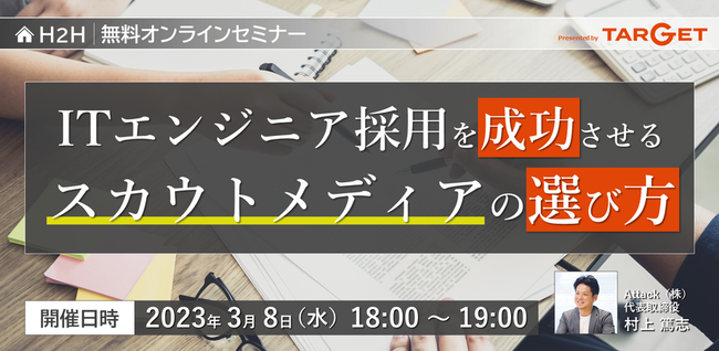 採用支援サービス『TARGET』などを展開するAttack株式会社(本社:東京都品川区、代表取締役:村上篤志)が経営者や採用責任者の方を対象とし、ITエンジニア採用を成功させる「スカウトメディア」の選び方をテーマにした無料オンラインセミナーを2023年3月8日(水)に開催致します。