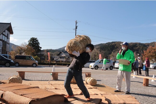 大人気企画です。1年間に一人あたりが消費するお米、一俵=約60kg(女性は30kg)を持ち上げられたら、池田の新米をプレゼントします。(雨天の場合は中止)