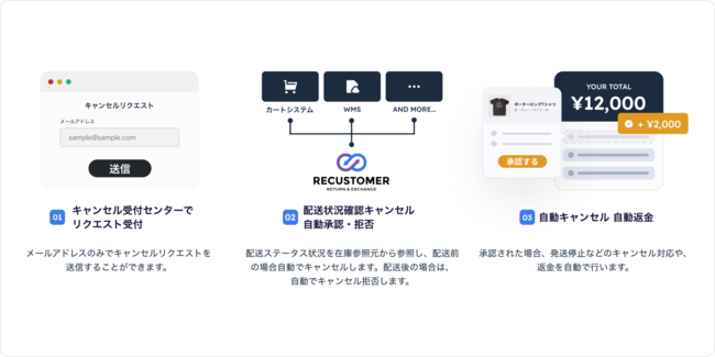 Recustomerは、ワンクリック決済「Recustomer Checkout」、商品追跡を実現する「Recustomer Tracking」、返品・交換・注文キャンセル業務を自動化するツール「Recustomer Return&Cancel」の3サービスからなる購入体験プラットフォームです。購入時点の決済領域や返品・交換・注文キャンセル領域から横断的に買い物客の購入体験の向上を後押しします。