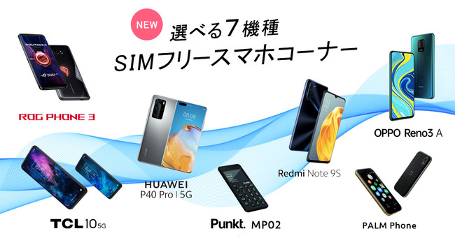 端末は、販売中の「Palm Phone」と「Punkt. MP02」のほか、コーナー開設にあわせ5機種を新たにラインアップ。+Styleが独占して先行販売を開始するTCL製「TCL 10 5G」のほか、ASUS「ROG Phone 3」、Huaweiの「HUAWEI P40 Pro 5G」、Oppoの「OPPO Reno3 A」、Xiaomiの「Redmi Note 9S」(順不同)を用意します。