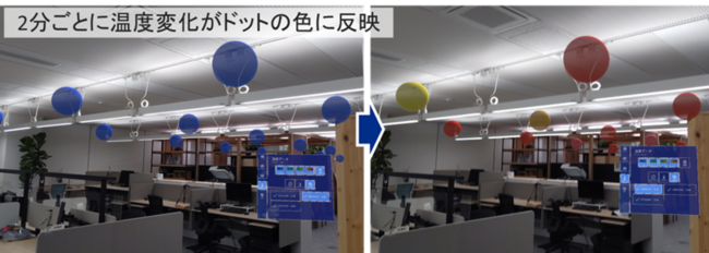 天井設置の(空気)温度センサのデータを計測用サーバで収集し、そのサーバからクラウドを介して環境ウォッチver.2に転送することで、実空間でのリアルタイム表示を実現。上図は空調の効果で室内温度が変化した様子