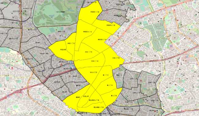 o宇田川町、神南1丁目、神宮前1丁目、神宮前4〜 6丁目、渋谷1〜4丁目、東1〜3丁目、猿楽町、代官山町、恵比寿西1〜2丁目