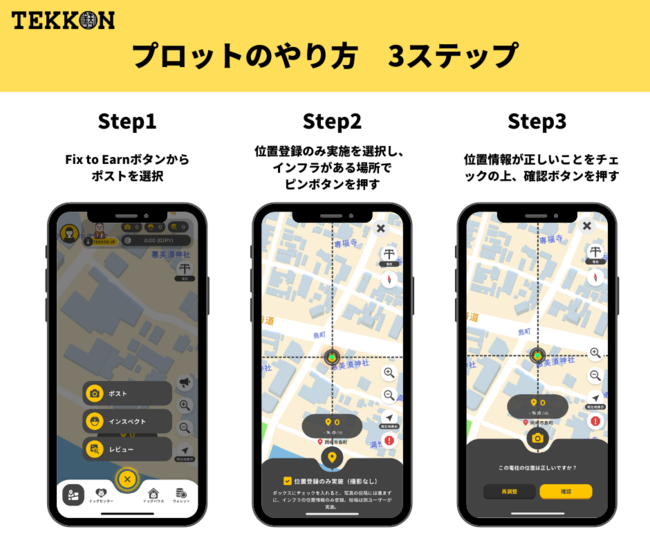 社会貢献型Web3アプリ「TEKKON」がさらに遊びやすく進化!位置情報のみの投稿を可能とする「プロット機能」を実装。登録された位置情報の精緻化を図り、より正確なインフラマップ構築へ。