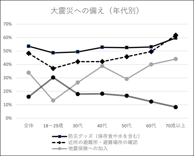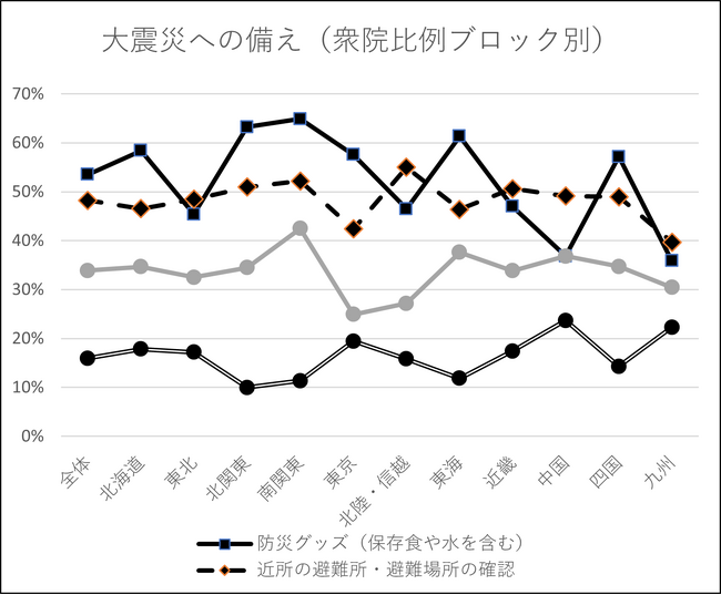 大震災への備えについては、衆院比例ブロック別と年代別のデータをグラフ化した。地域的には東京を除く関東と東海、四国で防災意識が比較的高い傾向がうかがわれる。首都圏直下型地震や東南海地震の危険が指摘されてきた影響だろうか。年代別では年齢が上がるほど大震災への備えに気を配る人が増える傾向にある。