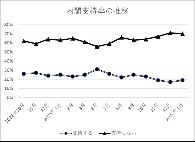 岸田内閣の支持率は19%で、前回12月3日の17%から2ポイント増の横ばい。昨年11月以降、2割を切る厳しい状況が続いている。不支持率は70%(前回比1ポイント減)だった。