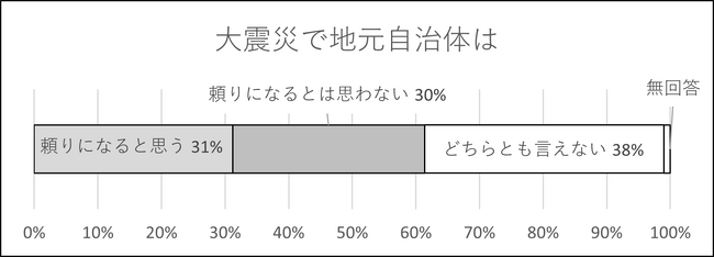 大きな地震災害に襲われた際に地元自治体が頼りになると思うかを尋ねたところ、「頼りになると思う」31%・「頼りになるとは思わない」30%・「どちらとも言えない」38%と回答が割れた。