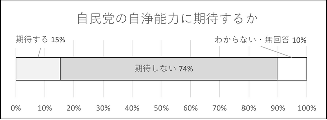 自民党の派閥の政治資金パーティーをめぐる事件について、自民党の自浄能力に「期待しない」との回答が74%に上り、「期待する」は15%にとどまった。自民党の派閥については「解消すべきだ」が63%を占め、「解消する必要はない」は16%だった。