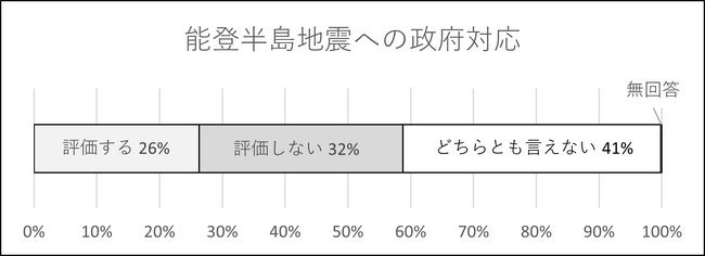 能登半島地震について、これまでの政府の対応を「評価する」との回答は26%で、「評価しない」の32%を下回った。「どちらとも言えない」が41%で最も多かった。