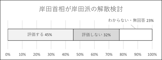 岸田首相が岸田派の解散検討を表明したことについては「評価する」が45%で、「評価しない」の32%を上回った。多額のパーティー券収入を裏金化していた安倍派については「解散すべきだ」が74%に上り、「解散する必要はない」は10%だった。