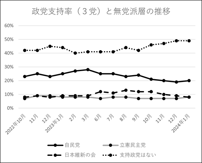政党支持率は自民党20%(前回19%)▽立憲民主党8%(同7%)▽日本維新の会8%(同9%)--などで、「支持政党はない」と答えた無党派層は49%(同49%)だった。維新の支持率は昨年1月以降、立憲民主を上回る状態が続き、8月には維新13%・立憲民主7%と5ポイント差を付けたが、その後、徐々に低下し、今回ついに並んだ。