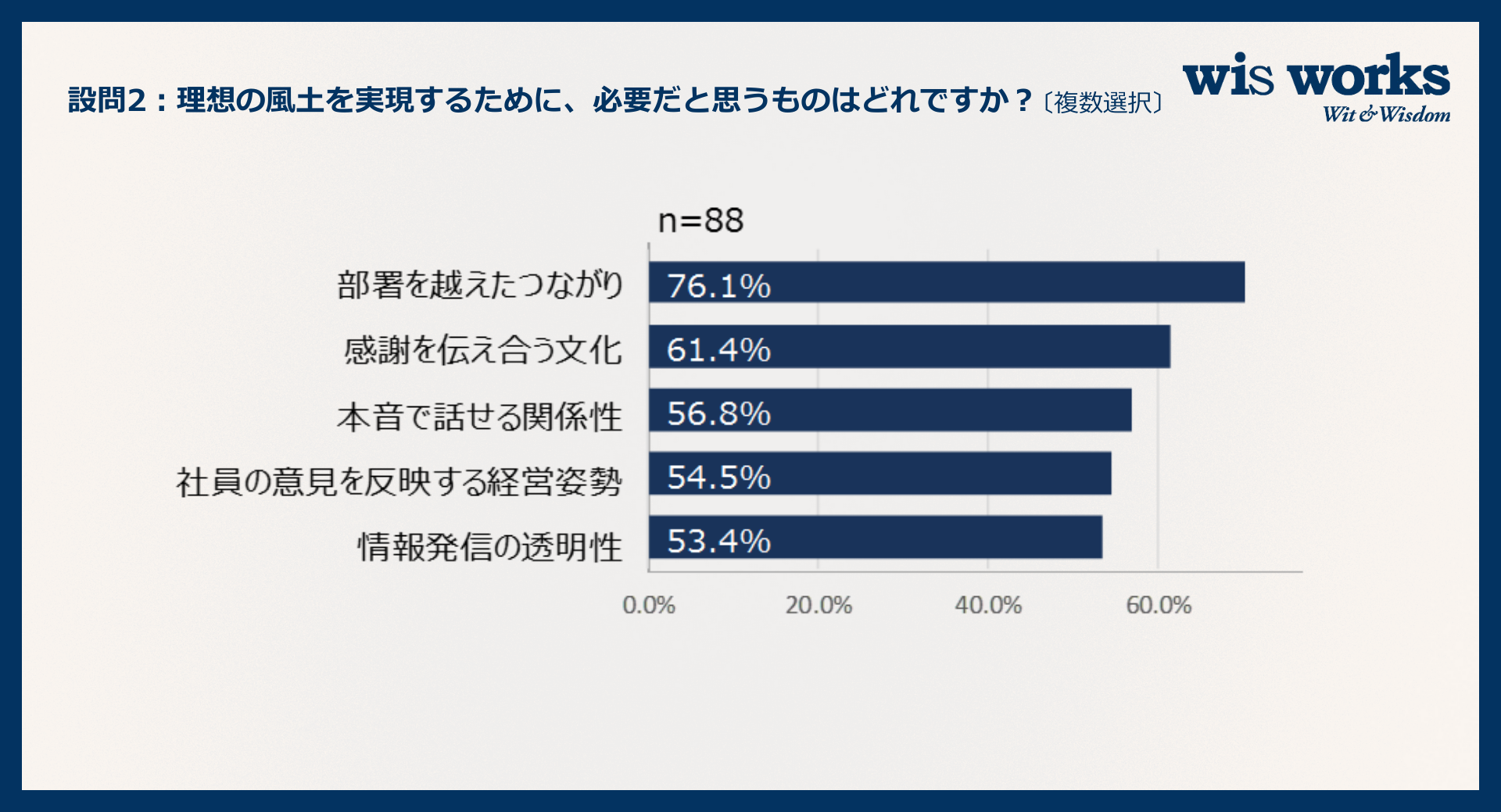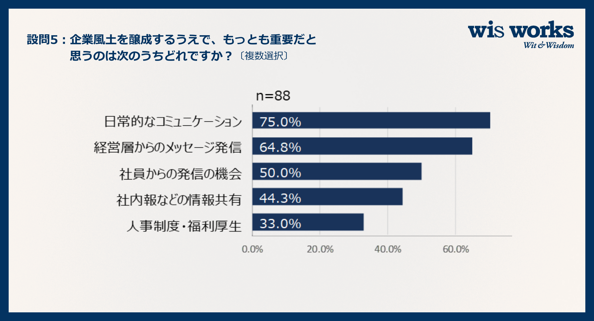 [画像6: https://prcdn.freetls.fastly.net/release_image/11829/31/11829-31-05fad64be7e005745317a76cae39c494-1920x1039.png?width=536&quality=85%2C75&format=jpeg&auto=webp&fit=bounds&bg-color=fff ]設問5:企業風土を醸成するうえで、もっとも重要だと思うのは次のうちどれですか?[複数選択]