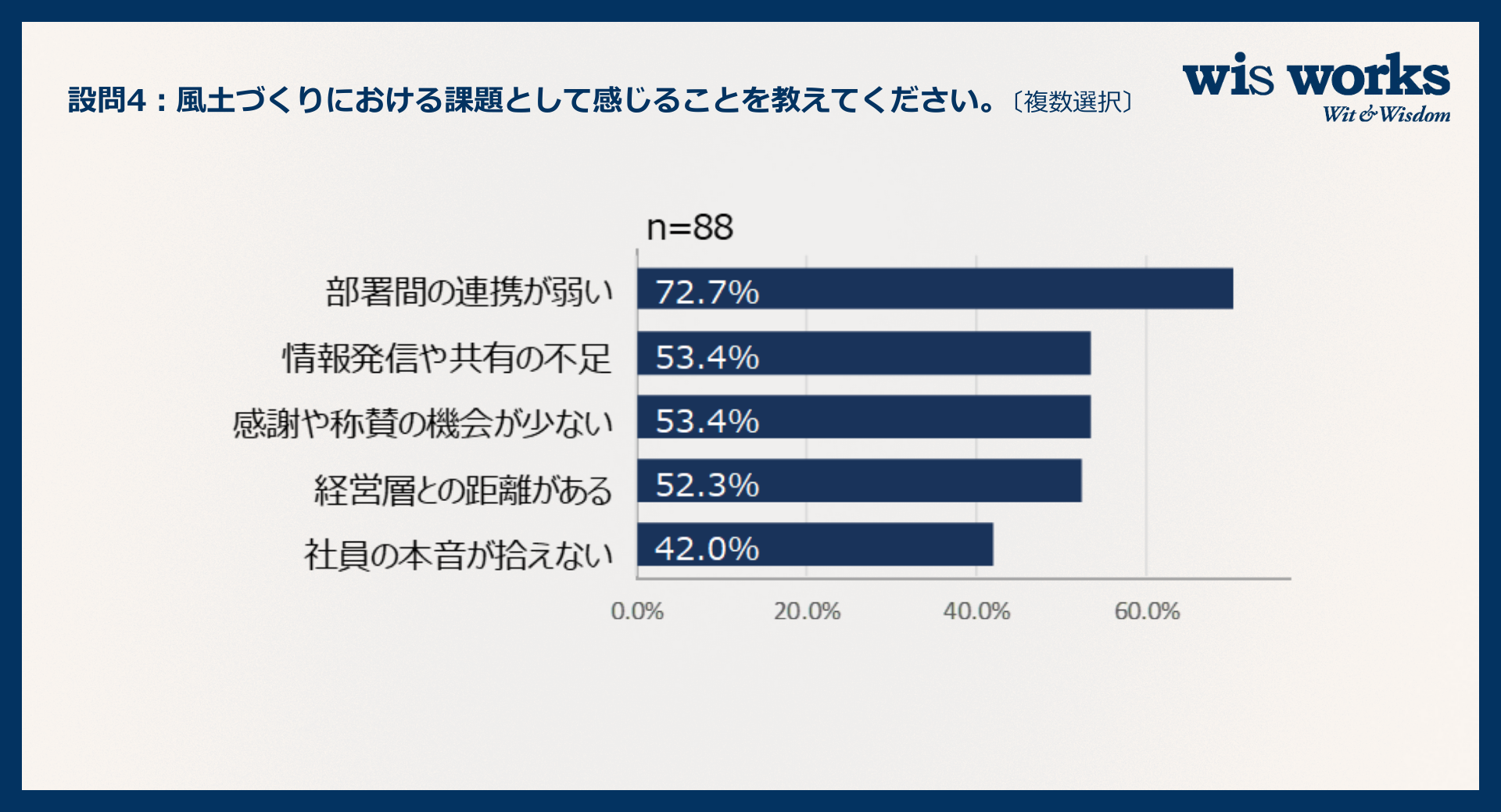 [画像5: https://prcdn.freetls.fastly.net/release_image/11829/31/11829-31-3ef09608e0e38456290db9ea1c93bfae-1920x1039.png?width=536&quality=85%2C75&format=jpeg&auto=webp&fit=bounds&bg-color=fff ]設問4:風土づくりにおける課題として感じることを教えてください。 [複数選択]