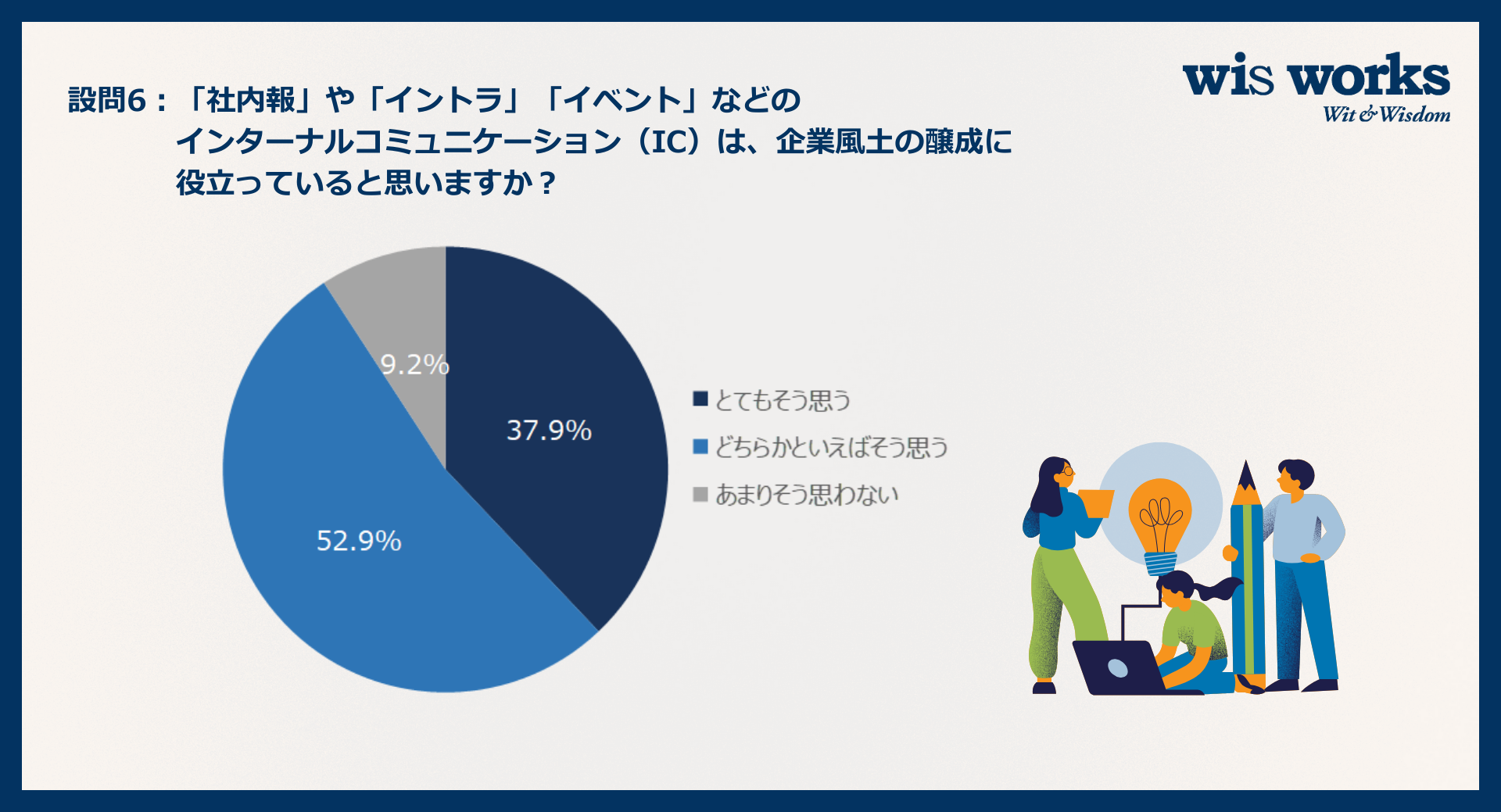 [画像7: https://prcdn.freetls.fastly.net/release_image/11829/31/11829-31-4346a6e8d0b6174a2ff785eebbccf330-1920x1039.png?width=536&quality=85%2C75&format=jpeg&auto=webp&fit=bounds&bg-color=fff ]設問6:「社内報」や「イントラ」「イベント」などのインターナルコミュニケーション(IC)は、企業風土の醸成に役立っていると思いますか?