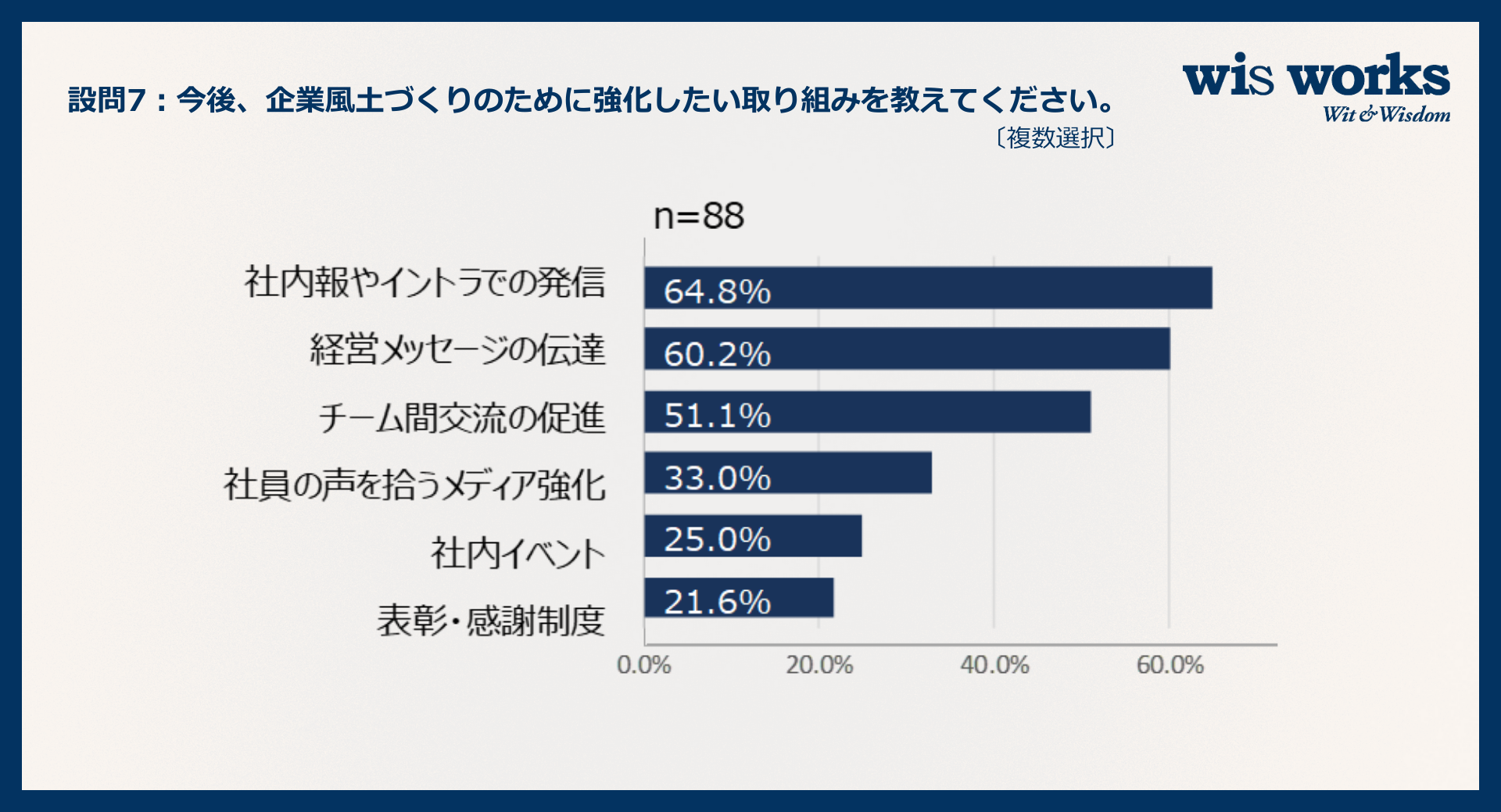[画像8: https://prcdn.freetls.fastly.net/release_image/11829/31/11829-31-7917ce3c5992db8d4f7a7e49ae9e25c6-1920x1039.png?width=536&quality=85%2C75&format=jpeg&auto=webp&fit=bounds&bg-color=fff ]設問7:今後、企業風土づくりのために強化したい取り組みを教えてください。[複数選択]