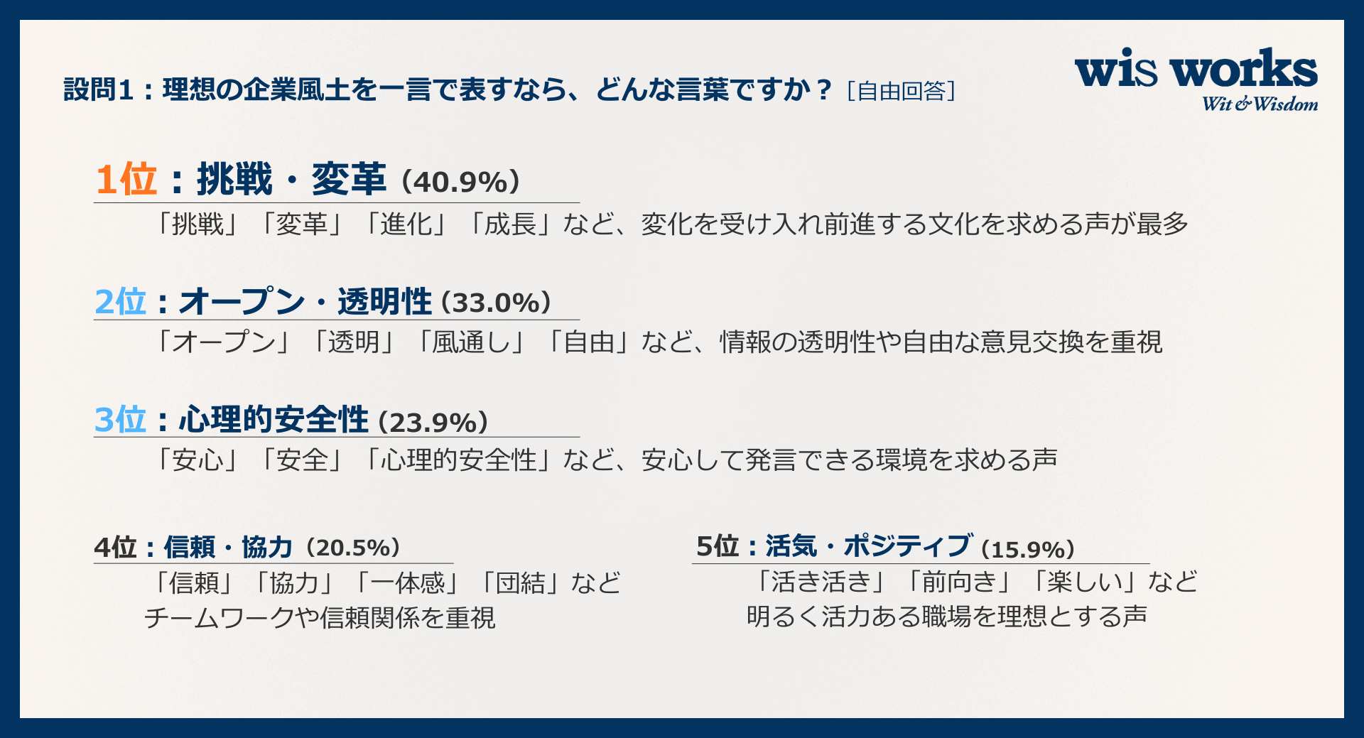 [画像2: https://prcdn.freetls.fastly.net/release_image/11829/31/11829-31-a5d81b83b9f74c296c247f706ae4ed25-1920x1039.png?width=536&quality=85%2C75&format=jpeg&auto=webp&fit=bounds&bg-color=fff ]設問1:理想の企業風土を一言で表すなら、どんな言葉ですか?[自由回答]