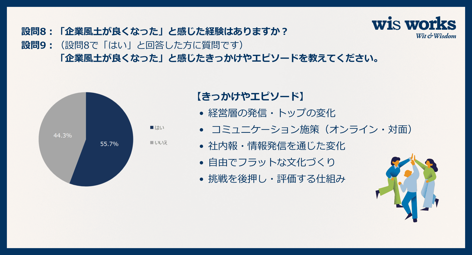 [画像9: https://prcdn.freetls.fastly.net/release_image/11829/31/11829-31-e9073869d5ab04a1c48d047f1cdcc010-1920x1039.png?width=536&quality=85%2C75&format=jpeg&auto=webp&fit=bounds&bg-color=fff ]設問8:「企業風土が良くなった」と感じた経験はありますか?設問9:設問8で「はい」と回答した方に質問です。「企業風土が良くなった」と感じたきっかけやエピソードを教えてください