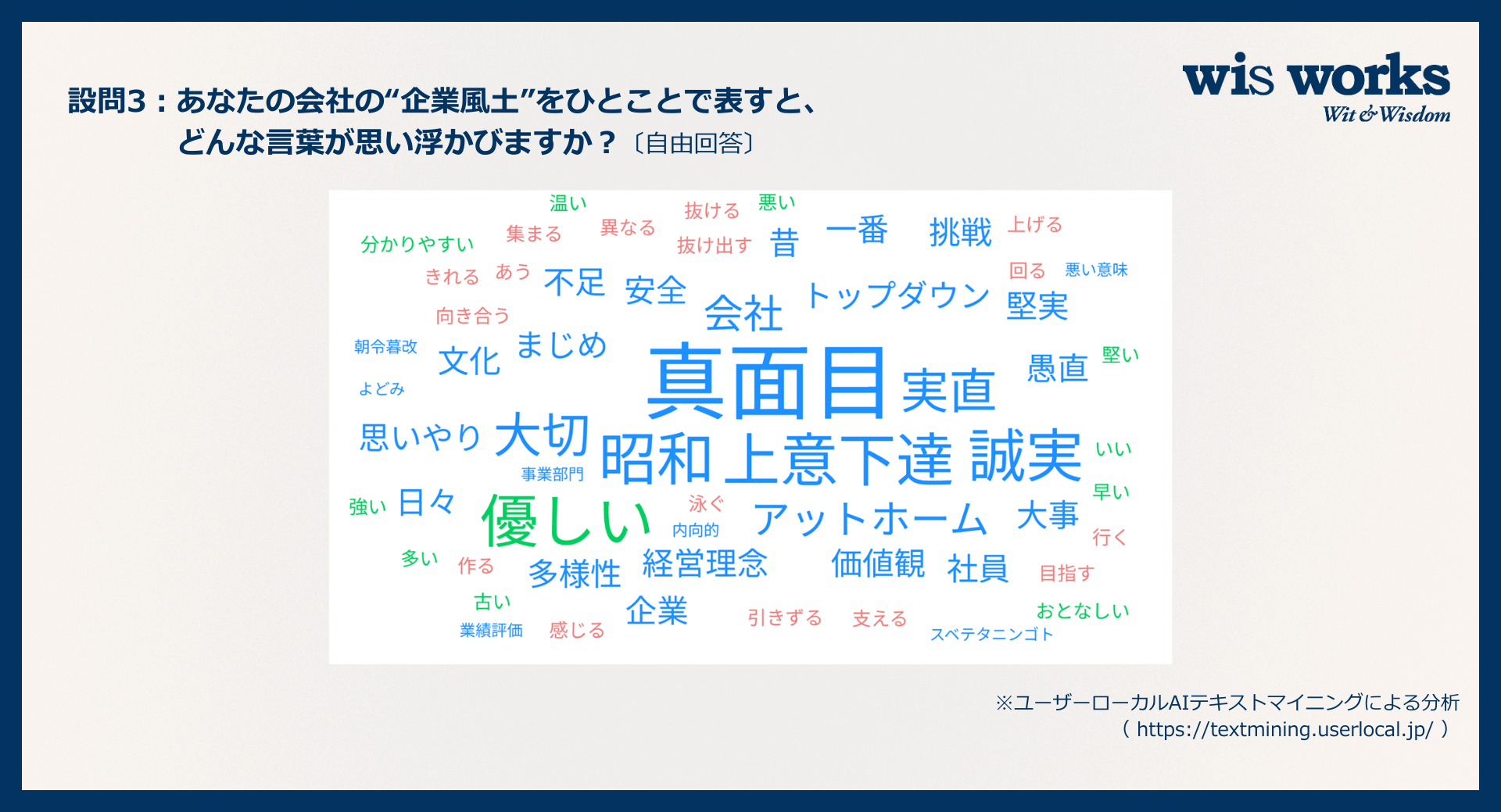 [画像4: https://prcdn.freetls.fastly.net/release_image/11829/31/11829-31-f14819cc0c3518ce55b35baa7859da30-1920x1039.png?width=536&quality=85%2C75&format=jpeg&auto=webp&fit=bounds&bg-color=fff ]設問3:あなたの会社の“企業風土”をひとことで表すと、どんな言葉が思い浮かびますか?[自由回答]