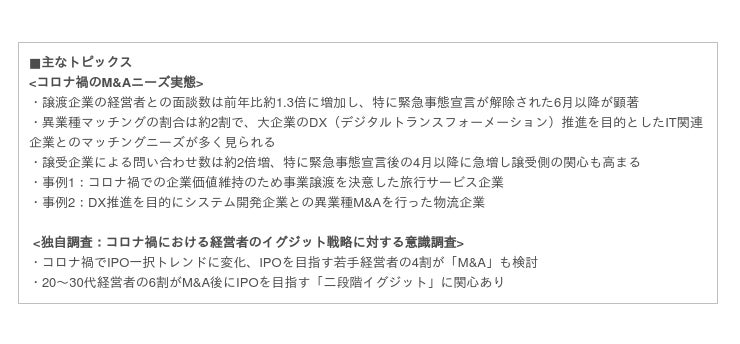 株式会社FUNDBOOK(本社:東京都港区、代表取締役CEO:畑野幸治、読み:ファンドブック、以下「当社」)は、この度、2020年1月から11月の当社への問い合わせや相談内容などの利用動向データをもとに、コロナ禍におけるM&Aニーズの実態や、新たな傾向をまとめた分析レポートを発表します。