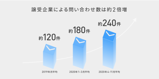 譲渡企業との面談数は約1.3倍、譲受企業の問い合わせ数は約2倍
