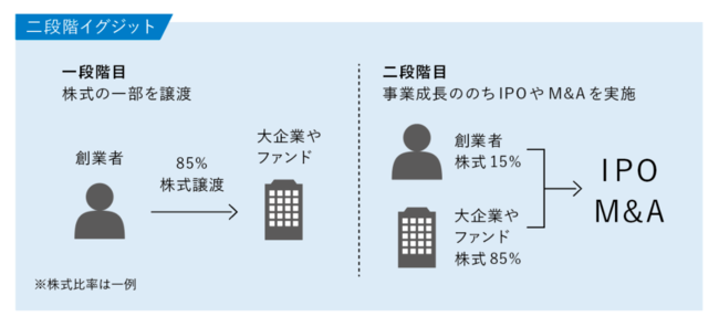IPOやM&Aを行う手法。利潤の一部をキャッシュとして早期に確定でき、パートナーの持つ豊富なノウハウや潤沢な資金を活用しながら事業成長を実現させることで、さらなる創業者利潤が得られる点が大きなメリット。主に自社の事業成長と、イグジットにおけるリターンの最大化を目的として実行されるが、昨今では、若い経営者を中心に、