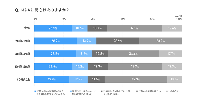 M&Aの検討状況については、全体の3割(37.1%)の経営者がM&Aに関心を示す結果となり、20〜30代経営者では4割(42.1%)でした。IPOを目指しながらM&Aも視野に入れ、確実なイグジット戦略を遂行したいと考える経営者が一定層いることが推測されます。