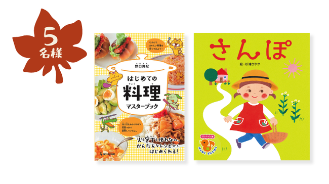 ワン・パブリッシングから『はじめての料理マスターブック』、ASOPPA!から『さんぽ』(フレーベル館)をセットにしてプレゼント! 6歳くらいまでのお子さんにぴったりのスペシャルセットで、家族みんなが楽しめること間違いなし!