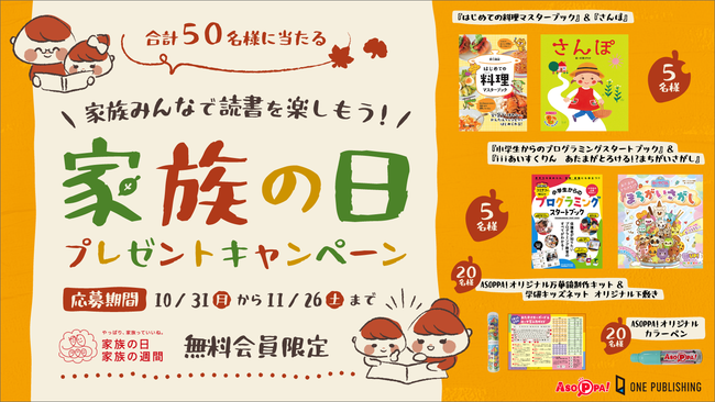 「家族の日」に合わせて、ASOPPA!とワン・パブリッシングは、以下のキャンペーンを実施いたします。ASOPPA!からは家族みんなで楽しめる絵本を、ワン・パブリッシングからは料理やプログラミングなど教育に役立つ本を、それぞれ2タイトルずつセットでプレゼント。その他、両社のスペシャルノベルティもご用意しております。