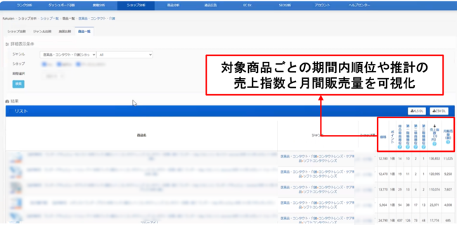 他社の取扱い商品ごとの期間内のランキング順位変動や推定売上の差異を特定することが可能