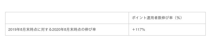 当社シードマネーによる残高、およびポイント投資による残高・解約額を除外して計算した。計算期間は2019年9月から2020年8月。