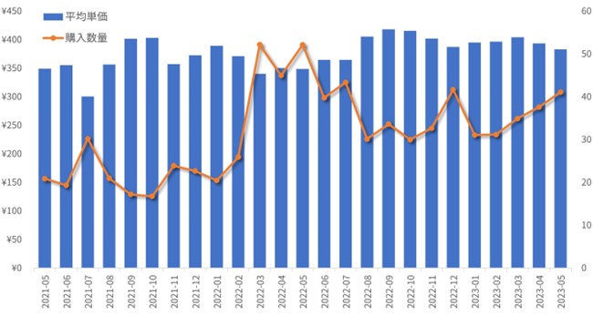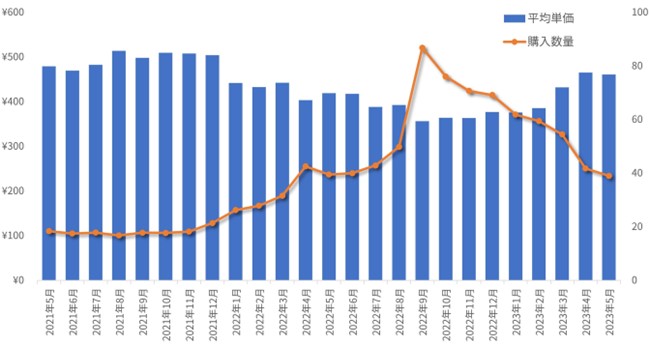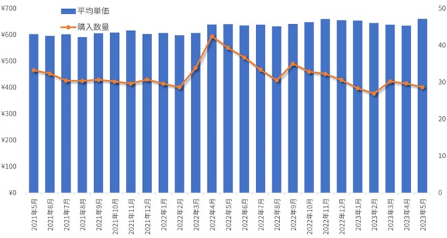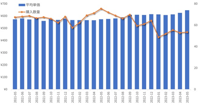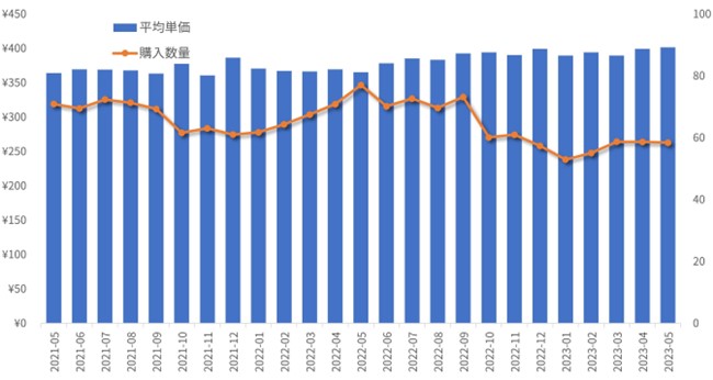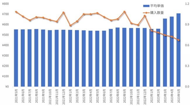 2021年5月と2023年5月の購入金額を比較すると105.1%と市場規模は拡大しているものの、2021年5月と2023年5月の購入数量を比較すると83.3%と減少しています。それは商品の平均購入単価が上昇していることで、購入数量が減っても購入金額は上昇した、ということになりました。