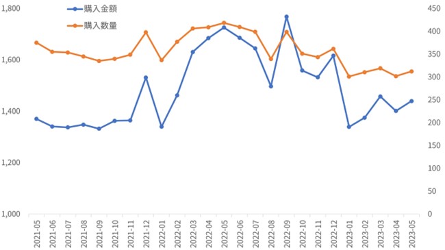 こちらは、油類の購入金額(青色)と購入数量(オレンジ)を2021年5月から2023年5月まで月別で表したグラフです。