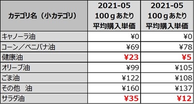 カテゴリ別で見れば、キャノーラ油の平均購入単価が大きく上昇し、健康油やサラダ油との価格差が縮まった結果、キャノーラ油ユーザーにとっては健康油やサラダ油との価格差が許容できる程度になったことから、ブランドスイッチが起こる可能性が高まっています。油カテゴリは他に代替できる商品カテゴリが多くないため、油カテゴリ内での競争が強くなっていくと思われます。
