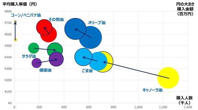 ・価格の上昇と共に購入数量は減少しているが、総購入金額は微増しており、油の市場規模そのものは変化していない。