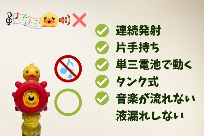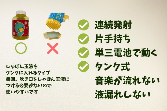 バブルガンを買う機会はあまりないかと思いますので、購入時にこのような想定をして商品ページをチェックしていないためついつい、知らずに買って後悔というケースが多いです。