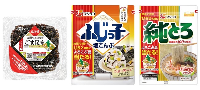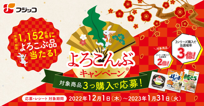 フジッコ株式会社(本社:神戸市中央区/代表取締役社長執行役員:福井正一)は、「ふじっ子煮」「ふじっ子(塩こんぶ)」「純とろ」各シリーズをご購入されたお客様を対象に、2022 年 12 月 1 日(木)から 2023 年 1 月31 日(火)までの間、『よろこんぶ(R)キャンペーン』を実施します。