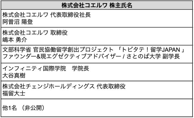 現在、課題山積みの日本において、あえて最重要課題を1つに絞り込むとしたら何か?と問われれば『教育』だと私は即答します。次世代を担う子どもたちがどのように育っていき、今よりも素晴らしい未来を創っていくかは教育という土台なしには語ることができません。コエルワがこの最重要課題に取り組む会社として、大きく飛躍することを期待しています。今回の体制変更及び社名変更に込めた想いを是非まっすぐに実現して欲しいと思います。