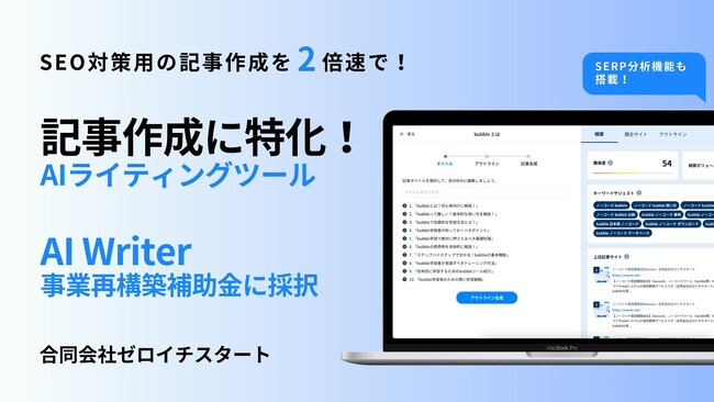合同会社ゼロイチスタート(本社:東京都中央区)が提供する、SEO対策用の記事作成をサポートするAIライティングツール「AI Writer」が、事業再構築補助金に採択されました。