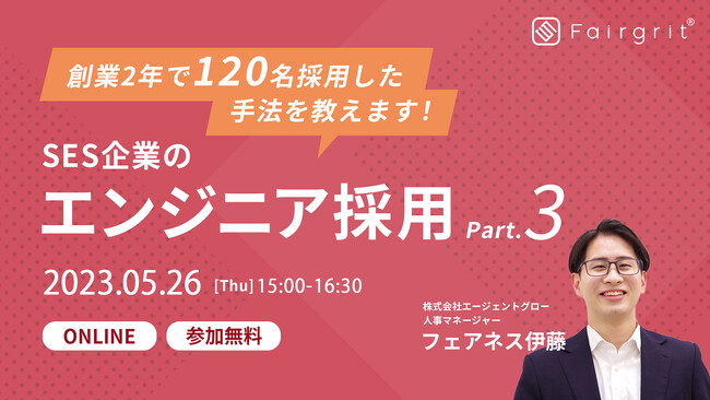 ------------------------------------- ■ 2023年5月11日(木) 15:00〜16:30 急成長中のSES企業で働く人事が語る、ぶっちゃけトークバラエティ『SES座談会』 詳細とお申込はこちらから!:https://www.agent-grow.com/fairgrit/useful/seminar/4652/