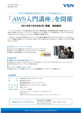 エンジ二ア人材サービスの株式会社VSN(アデコグループ、本社:東京都港区、代表取締役社長:川崎健一郎)は、クラウド時代に必要とされるエンジニアとして活躍したい方、最新トレンド技術を身につけたい方のために「AWS(Amazon Web Services)入門講座」を開催します。