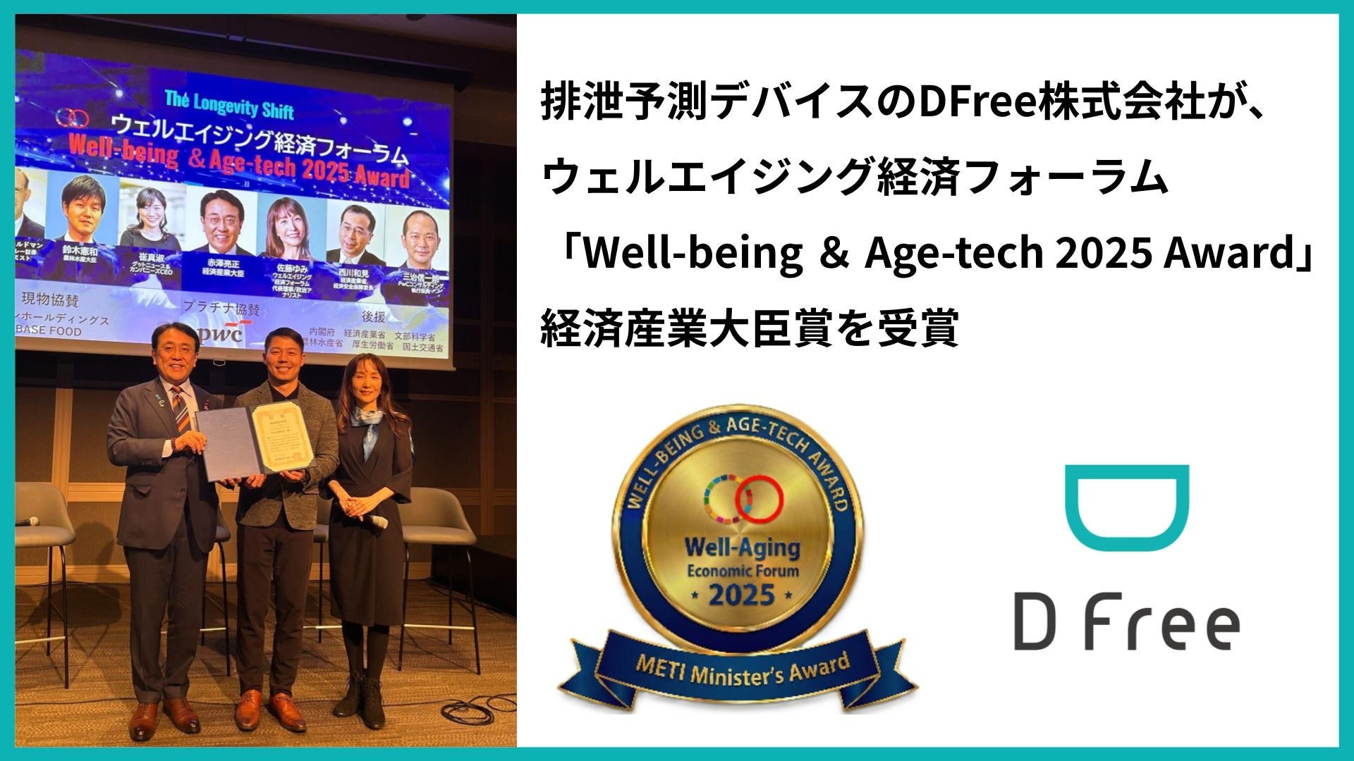 排泄予測デバイス「DFree」の企画・開発・販売を行うDFree株式会社(本社:東京都港区、代表取締役:中西 敦士、以下「当社」)は、2025年12月16日に開催された「Well-being & Age-tech 2025 Award」(主催:ウェルエイジング経済フォーラム)において、経済産業大臣賞を受賞したことをお知らせいたします。