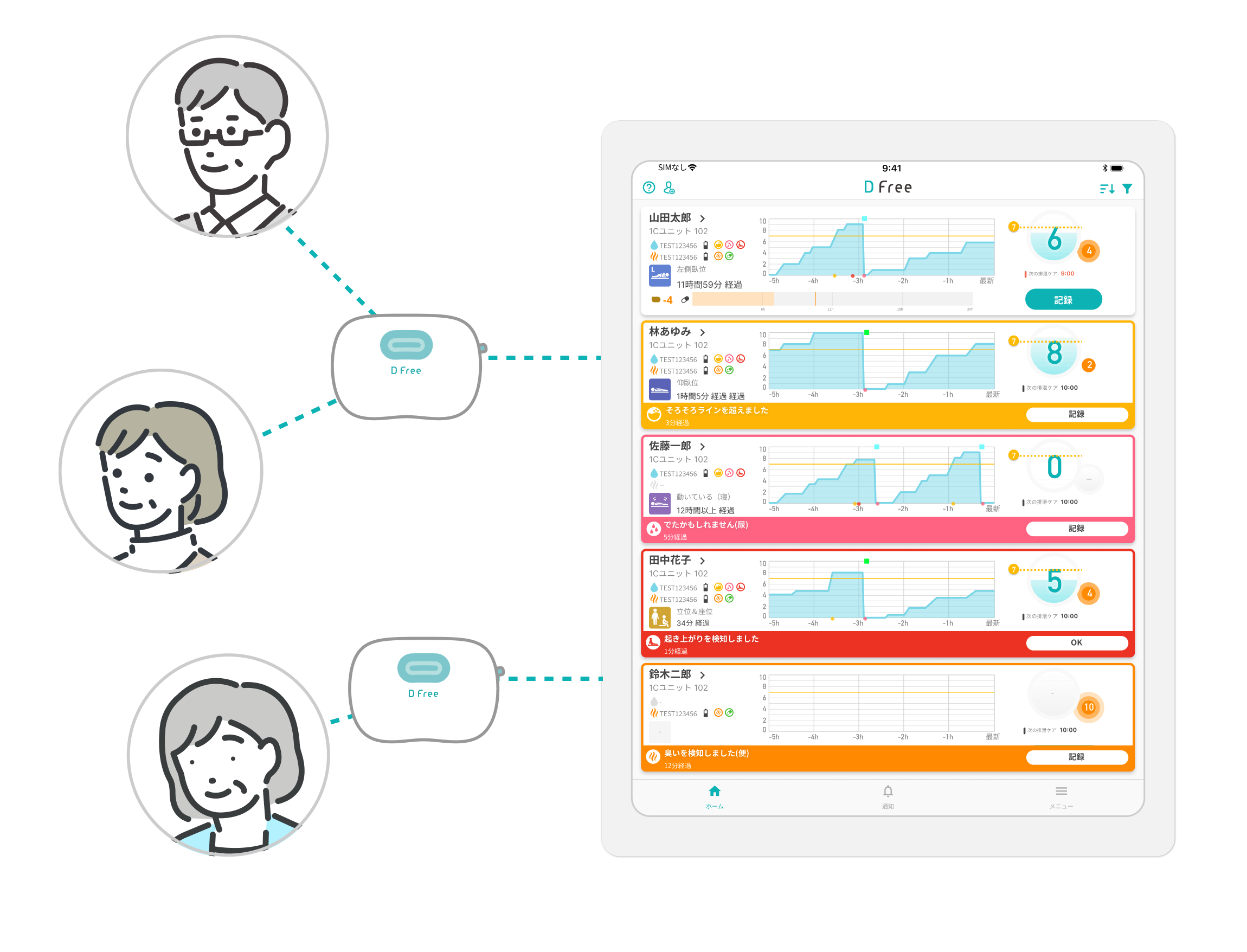 医療・介護施設向けDFreeは、複数の入居者の排尿データをアプリで一元管理可能