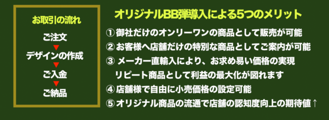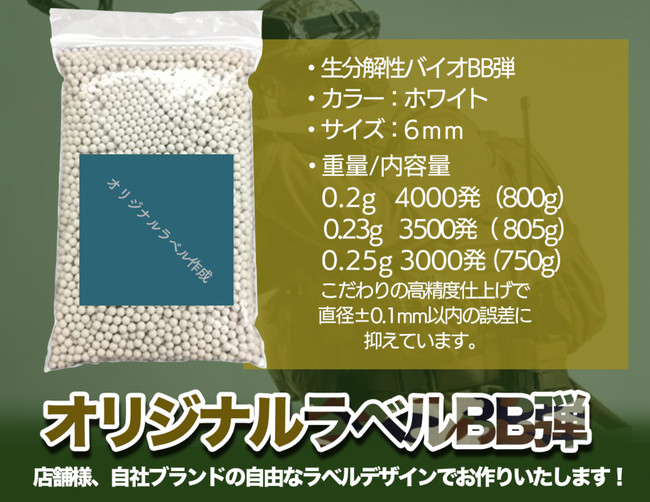 エアガンの販売にとって必要不可欠な消耗品のBB弾は店舗にとっても大事なメイン商材となります是非この機会に既製品だけに頼らない『ショップ限定オリジナルBB弾』の店舗への導入のご検討をお願い致します。