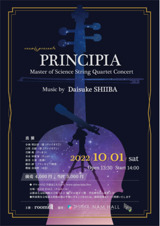 株式会社room6(本社:京都市左京区、代表取締役:木村征史)は、2022年10月1日に京都・NAM HALLにて「PRINCIPIA: Master of Science String Quartet Concert -Music by Daisuke SHIIBA-」を開催することをお知らせいたします。また演奏会とアプリ公開5周年を記念して「プリンキピア:マスター・オブ・サイエンス」スマートフォン版の無料セールを実施いたします。