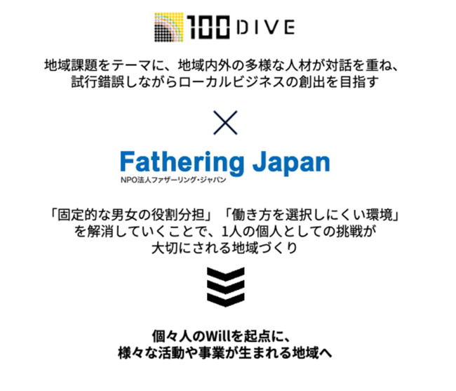 ローカルビジネススタートアップ支援の株式会社100DIVE(東京都豊島区:代表取締役 庄司弥寿彦・嶋田俊平)は、人を起点にした地方創生をさらに力強く推進すべく、挑戦が生まれる地域の土壌づくりに向けて、NPO法人ファザーリング・ジャパン(東京都千代田区 代表理事:安藤哲也 以下、FJ)と業務提携を行います。