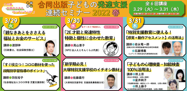 合同出版では連続セミナー「合同出版 子どもの発達支援 連続セミナー 2022春」を2022年3月29日(火)〜3月31日(木)に全6回講座で開催いたします。