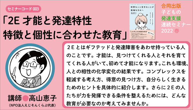 セミナーコード003「2E 才能と発達特性 特徴と個性に合わせた教育」講師 高山恵子(NPO法人えじそんくらぶ代表)