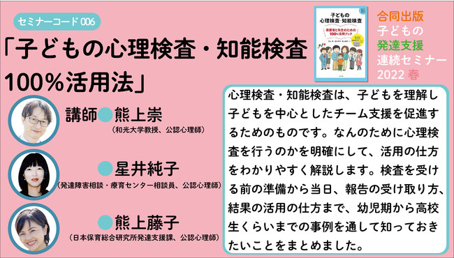 セミナーコード006「子どもの心理検査・知能検査100%活用法」熊上崇(和光大学教授、公認心理師)+星井純子(発達障害相談・療育センター相談員、公認心理師)+熊上藤子(日本保育総合研究所発達支援課、公認心理師)