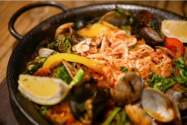 桜海老とアサリ、菜の花の具沢山パエリア ミクスタ