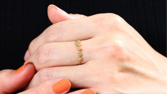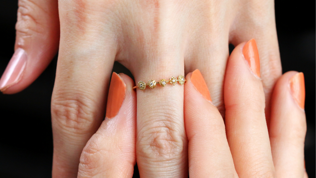 お花をモチーフにしたリングですが、普段使いできるように華奢に仕上げました。さりげなく身に着けられる「大人の花飾りリング」です。
